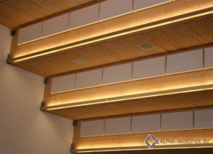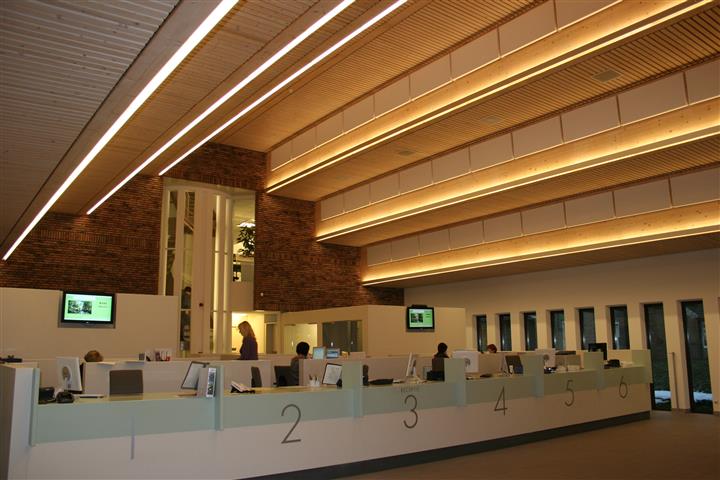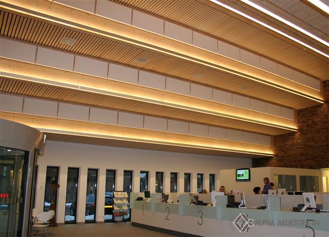 Door ons zijn geluidabsorberende baffles aangebracht tegen de zijkanten van het trapsgewijze oplopende plafond.